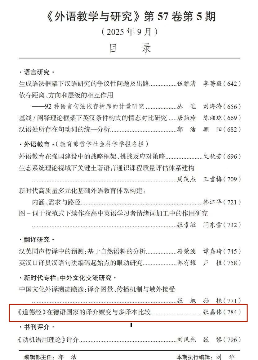 bet356唯一官网体育张嘉伟老师撰写的“《道德经》在德语国家的译介嬗变与多译本比较”发表在《外语教学与研究》2025年第5期,是bet356唯一官网体育教师发表的第一篇外语学科领域顶刊论文