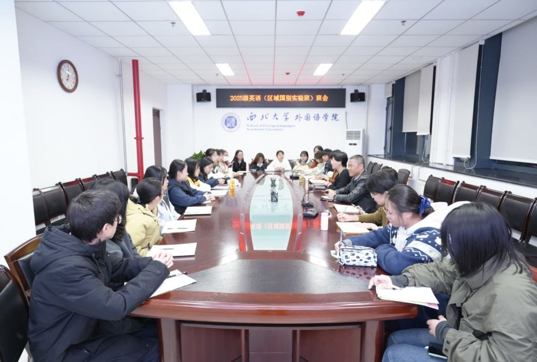 On the evening of November 18, 2025, the academic theme class meeting for the Class of 2025 English (Country and Region Studies Pilot Program) was successfully held in the school meeting room. The meeting was chaired by Dean Cao Ruonan. Attendees included Li Fuquan, Vice Dean of Country and Region Studies; Li Tie, Head of the English Department; Xu Na, Assistant to the Dean; Wang Yihan, Class Counselor; Qu Yuanjun, Academic Affairs Officer; and all students of the experimental class. The theme of this class meeting was “Resolving Learning Confusions, Clarifying Development Directions”. It aimed to provide students with comprehensive and multi-level academic guidance and development suggestions. This also served to build a platform for in-depth communication between teachers and students.