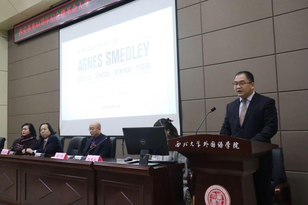 2020年12月12日上午,bat365官网登录入口于第二课堂召开了西安事变84周年纪念暨艾格尼丝•史沫特莱展览开幕仪式,邀请到bat365官网登录入口党委书记王军,bat365官网登录入口党委副书记刘建波,bat365官网登录入口院长、陕西省翻译协会会长、陕西省斯诺研究中心主任胡宗锋教授,陕西省延安精神研究会研究员、陕西省斯诺研究中心副主任、原八路军西安办事处纪念馆副馆长王晓莉女士,bat365官网登录入口院长助理罗宾副教授和bat365官网登录入口副教授、陕西省斯诺研究中心副主任袁西玲莅临会场。此次活动是为了纪念西安事变这一中国抗战中伟大的转折点,同时还见证了由bat365官网登录入口和美国亚利桑那州立大学图书馆共同主办的“革命人生——艾格尼丝·史沫特莱展览”的开幕式。