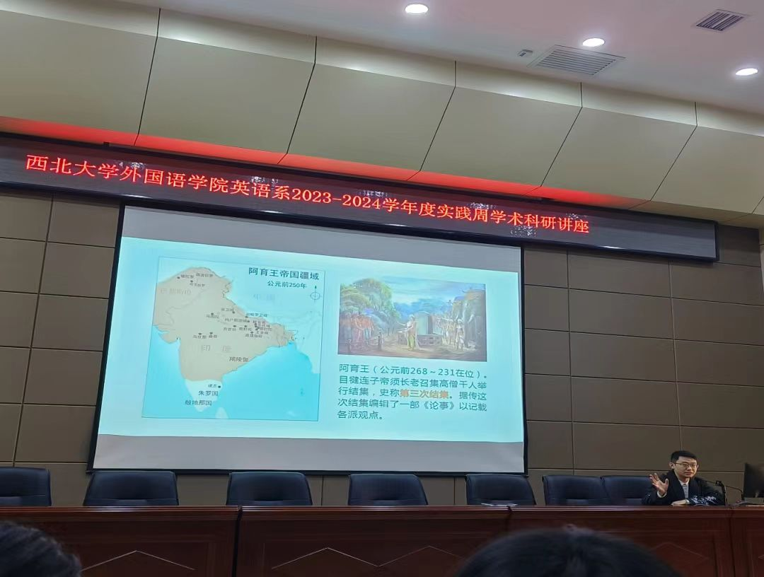 此外,为打破学科知识壁垒,强化交叉学科知识融合的新文科发展理念,bat365官网登录入口特邀俩位嘉宾为师生呈现了别开生面的知识盛宴,一位是中东研究所的谢志斌副教授。谢老师以“中国古代佛经的翻译及其接受和传播”为核心话题,以充沛地讲解和大量文献史实,向同学们揭示了中国佛经翻译的当代意义;另一位是西安田本农用化学有限责任公司王晓晨先生。王总经理通过分享创业历程,鼓励同学们在多元化的环境中不断提升跨文化交流能力、勇敢追求职业梦想,他的职业规划建议在同学们中引起了强烈的共鸣。