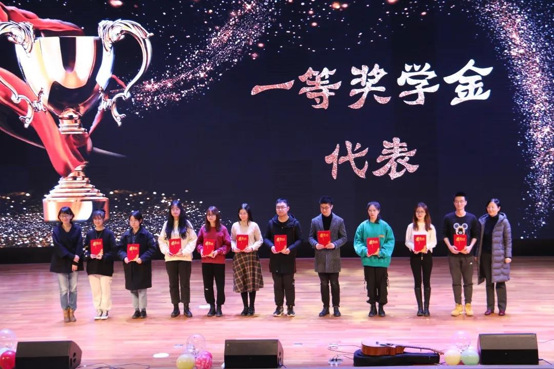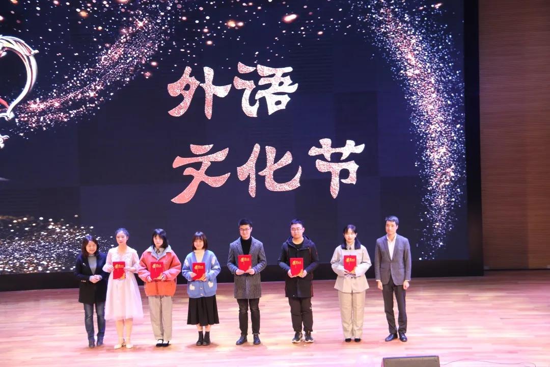 颁奖环节到来,党委书记王军、院长胡宗锋、副院长任海棠、副院长曹若男、党委副书记刘建波、工会主席陈汉良、英语系主任苏蕊、日语系主任胡竹清分别为获得国家奖学金的2位同学、一等奖学金的10位同学、励志奖学金的6位同学、优秀学生干部的5位同学和外语文化节比赛中获得一等奖的6位同学颁奖。