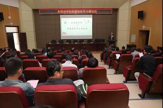 在主题活动开展前,党委书记王军向学院教师传达了学校关于开展师德宣传月活动的文件精神,要求所有教师在教学活动的开展中要注重师德师风,要有“四个好老师”、“四个引路人”的职业追求。院长胡宗锋随后补充到作为教师,课堂上的言行要对得起学生,要做到不迟到不早退等基本职业要求。