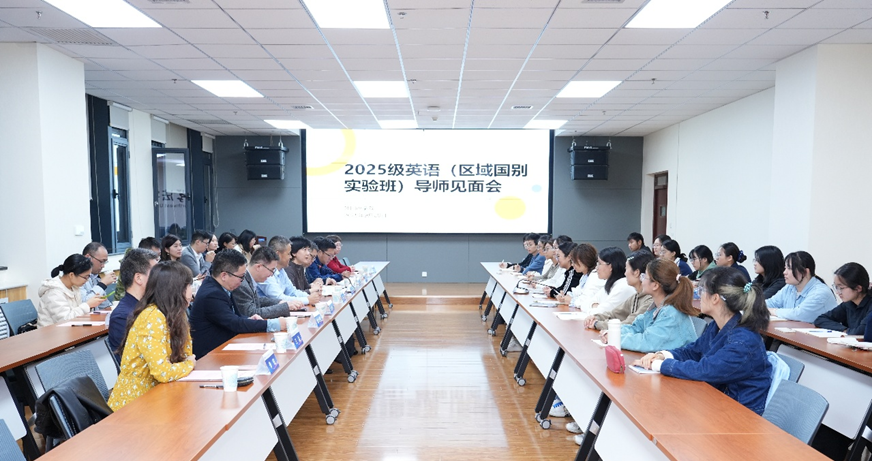2025年9月28日晚7时,bat365官网登录入口2025级英语(区域国别实验班)学业导师见面会在我校长安校区西学楼北0904报告厅顺利举行。会议由bat365官网登录入口院长曹若男主持,区域国别学院副院长李福泉、全体学业导师、bat365官网登录入口英语系主任李铁、班级教务、辅导员、相关负责人及实验班 20名同学共同参会。