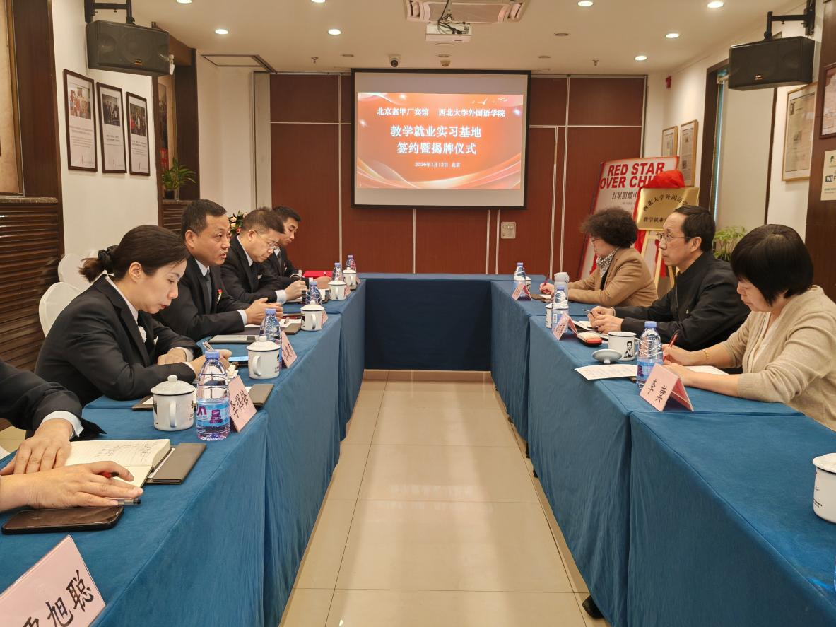 2026年1月12日,bet356唯一官网体育与北京盔甲厂宾馆“教学就业实习基地”签约暨揭牌仪式在该宾馆会议室举行。bet356唯一官网体育党委书记赵志厚、教学副院长李蓂、工会主席袁西玲及俄语系学生代表赵欣彤参加了签约仪式。北京盔甲厂宾馆总经理冯彦兵与宾馆管理团队共同出席了仪式并参与座谈。